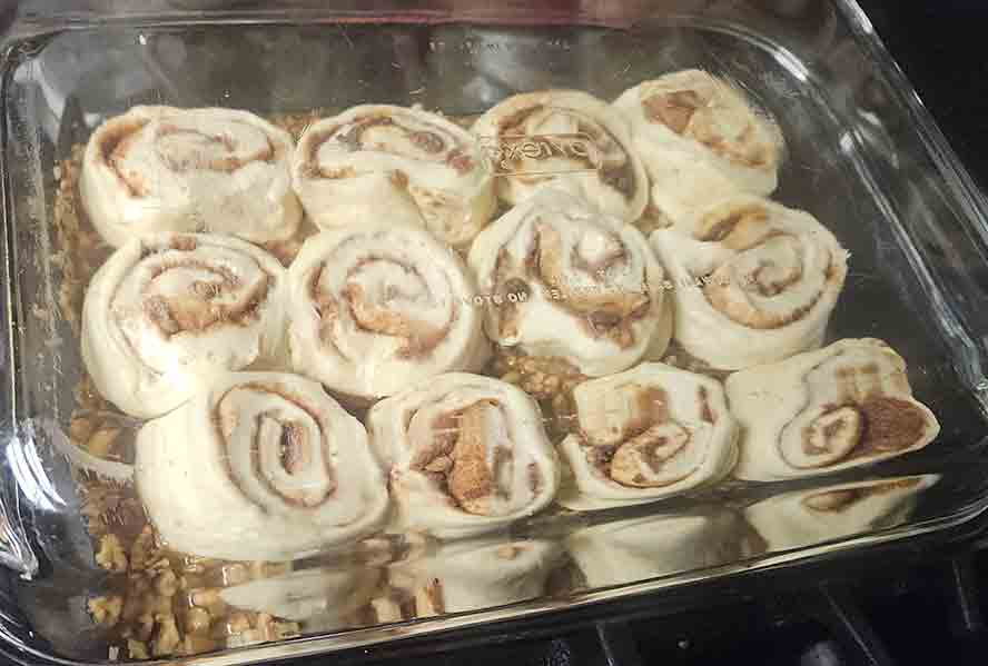 I also like to bake them in a 9 x 13 baking dish with a walnut sticky topping. When you get to the rolled up then you can jump down to here to make the Sticky Buns |