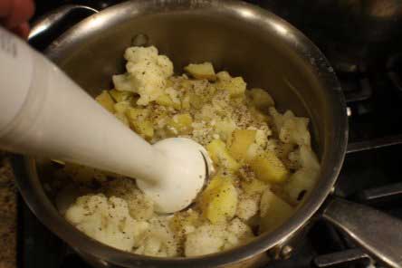Add a little butter if desired and mash the potato with a hand masher, wire whisk or an Immersion blender like shown in the picture. Either way it is simple and You can do it right in the pan.   |