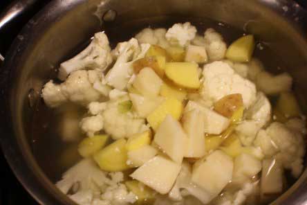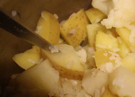 The potatoes should take about 20 minutes to cook. Test by sticking a knife in a potato chunk.                     |