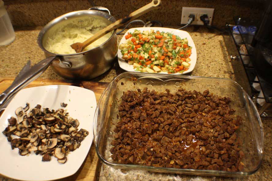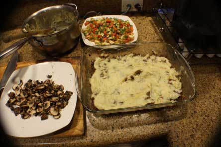 The first layer is the beef. Notice I have the braising liquid there as well. The potatoes will thicken this a little to make