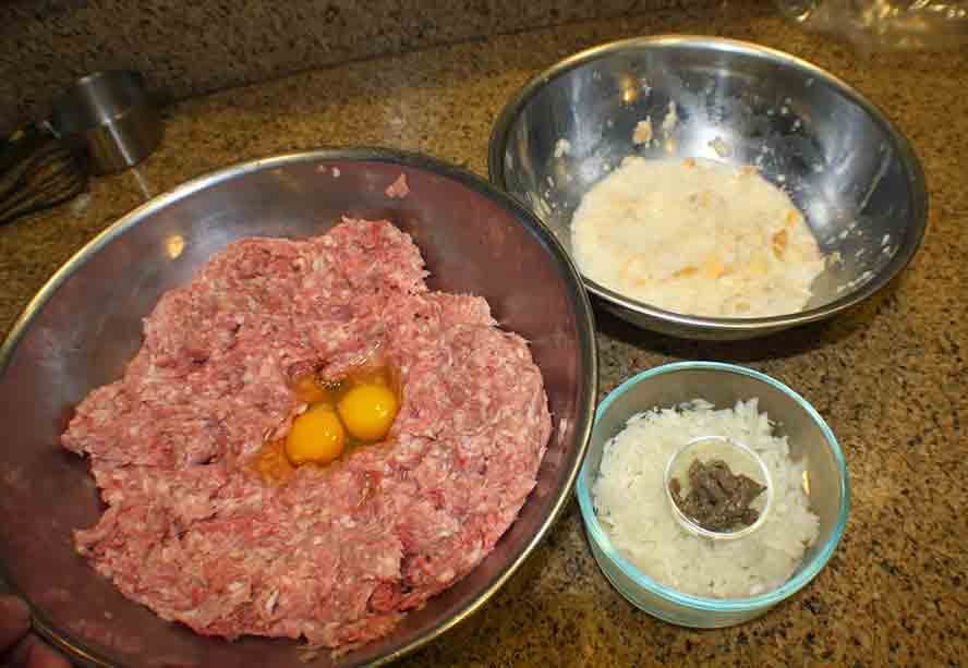Place bread in mixing bowl with the ground beef. Add the bacon, anchovy fillets, onion, egg,