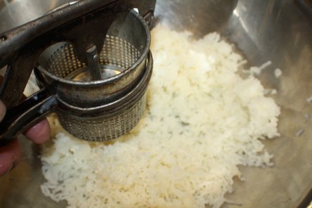 Boil the potatoes, peel and mash or put through a ricer.