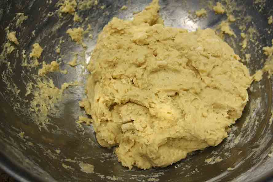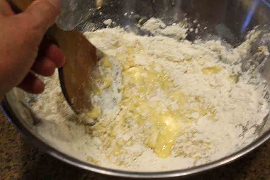 Mix the wet ingredients in with the dry ingredients, then add the butter and work it in just enough...