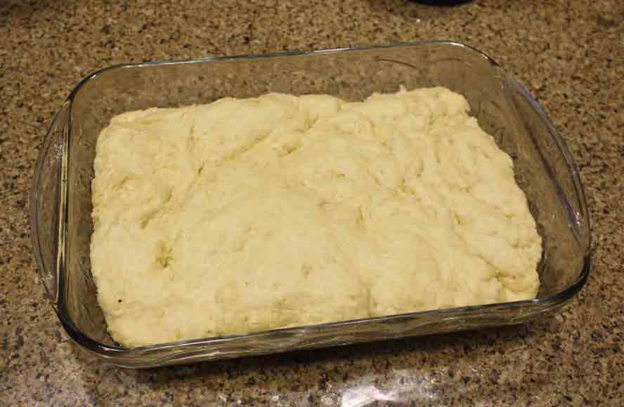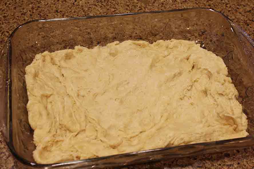 Spread the dough evenly into the pan of your choice. Round, square or rectangular pans