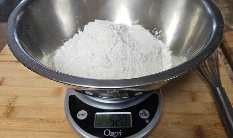 For one 9" x 13 " crust measure out 375 grams which is about 2 1/2 cups.