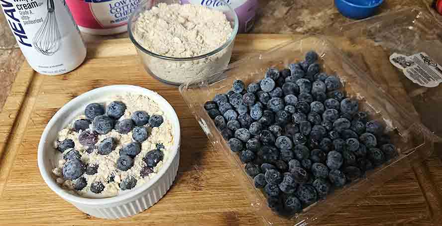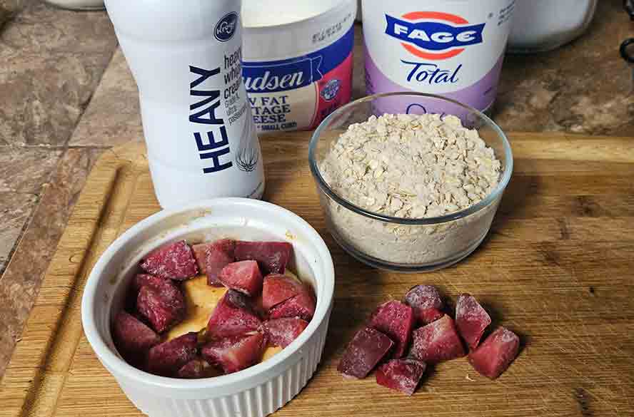 Generally I mix 1 egg with 1 cup of cream, yogurt or blended cottage cheese, 1 tablespoon sugar and some