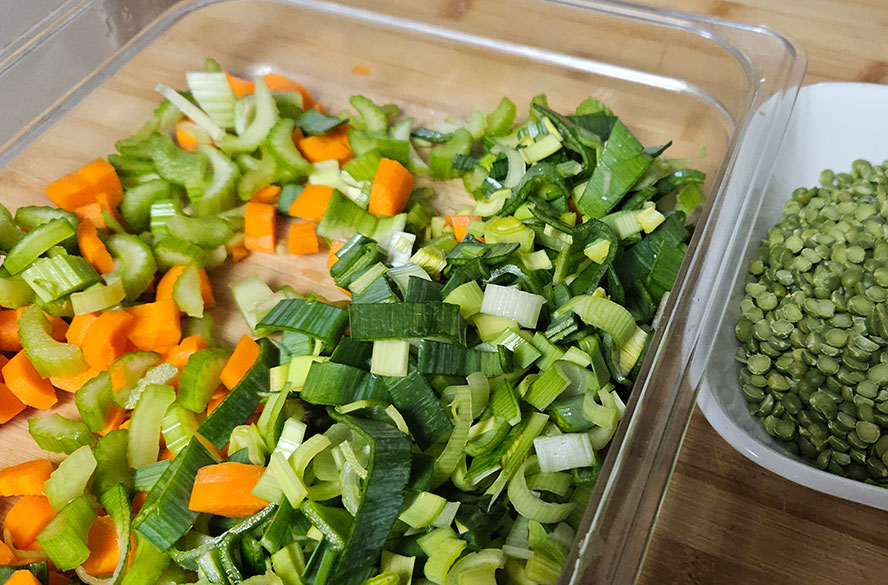 Chop everything to a medium dice, and be sure and give the leeks a wash, as soil gets into the leaves.