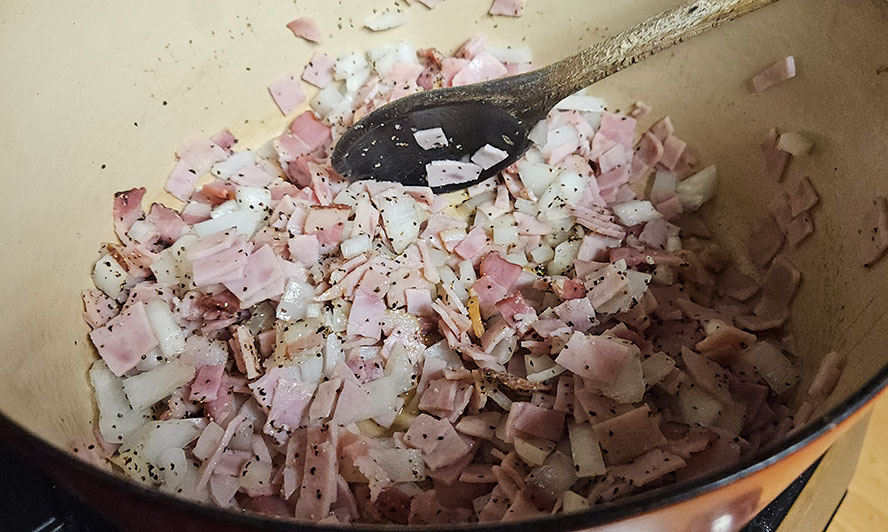 1 ham hock or approx. or 1 cup of dice ham or bacon