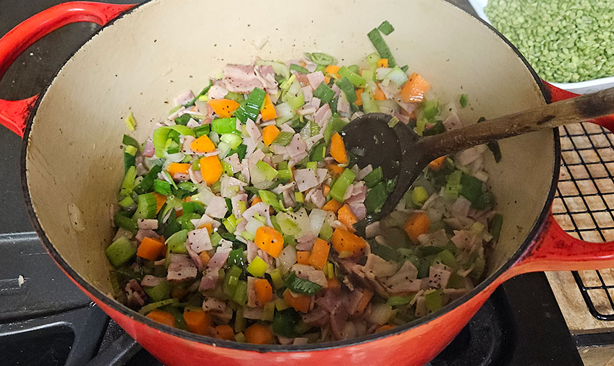 Next add your stock and bring to a simmer. add the split peas.